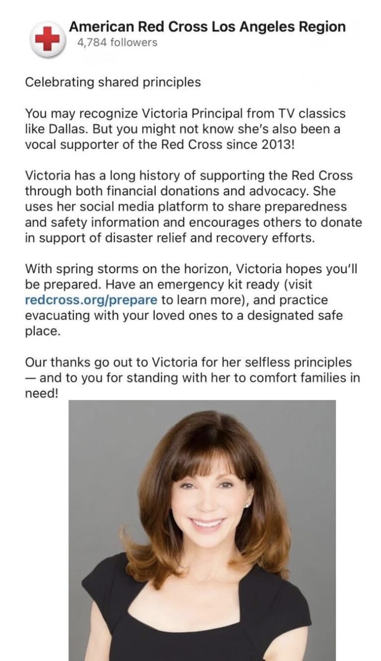 Vous connaîssez peut-être Victoria Principal de classiques de la télévision comme Dallas. Mais vous ne savez peut-être pas qu’elle est également une porte parole de la Croix-Rouge depuis 2013 !
