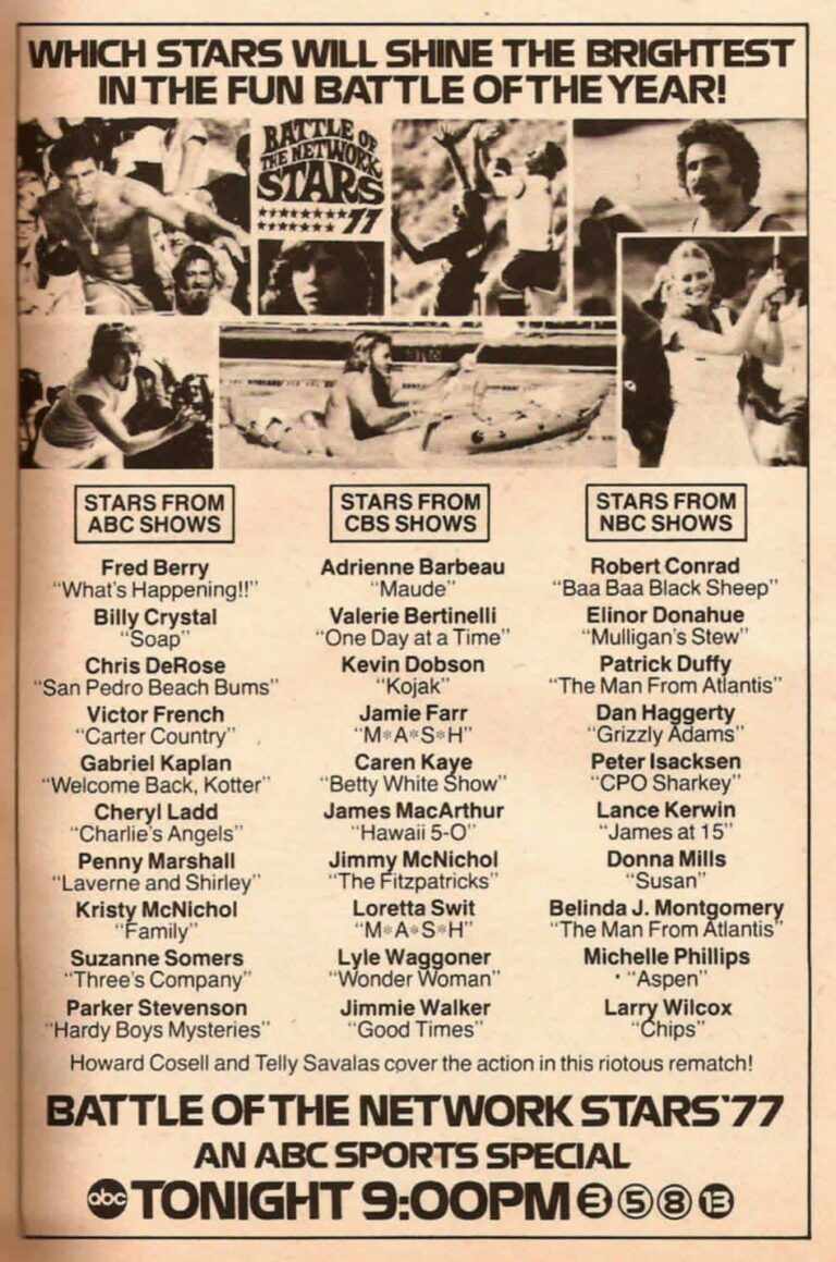 Le casting de l’émission reste l’un de ses attraits majeurs. Les icônes des années 70 et 80 y ont participé, représentant fièrement leur chaine. Parmi eux, on retrouve Farrah Fawcett et Jaclyn Smith de Drôles de dames, Lynda Carter de Wonder Woman, Linda Evans et John James de Dynastie, ou encore William Shatner de Star Trek. D’autres visages familiers incluent David Hasselhoff de K 2000, Heather Locklear de T.J. Hooker, ou encore Scott Baio de Happy Days. Ces figures emblématiques rivalisaient sous le regard aiguisé et souvent plein d’humour de Howard Cosell, le légendaire commentateur sportif, qui donnait à l’émission une saveur encore plus unique.