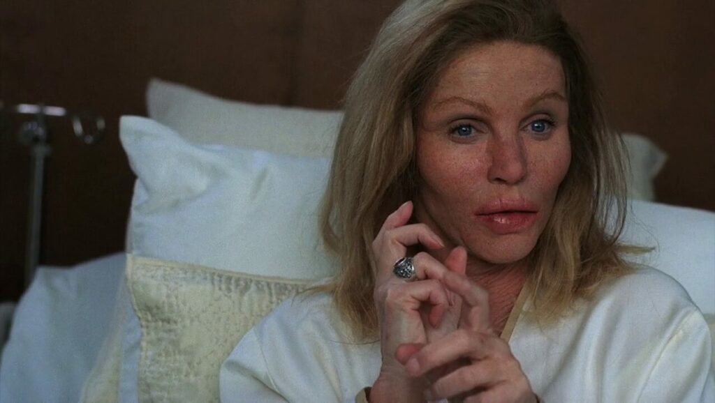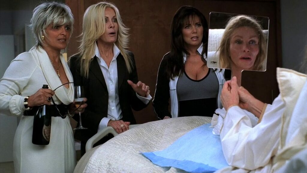 La réaction de Joa nVan Ark lors de la scène ou Donna Mills enlève ses bandages est particulièrement savoureuse, lorsque l’on sait que Joan Van Ark est fréquemment critiquée sur les réseaux par rapport à son physique et les soupçons de chirurgie. Les actrices n’hésitent pas à se moquer subtilement d’elles-mêmes et l’on notera également que Deborah Shelton met particulièrement en avant sa généreuse poitrine dans la scène du diner.