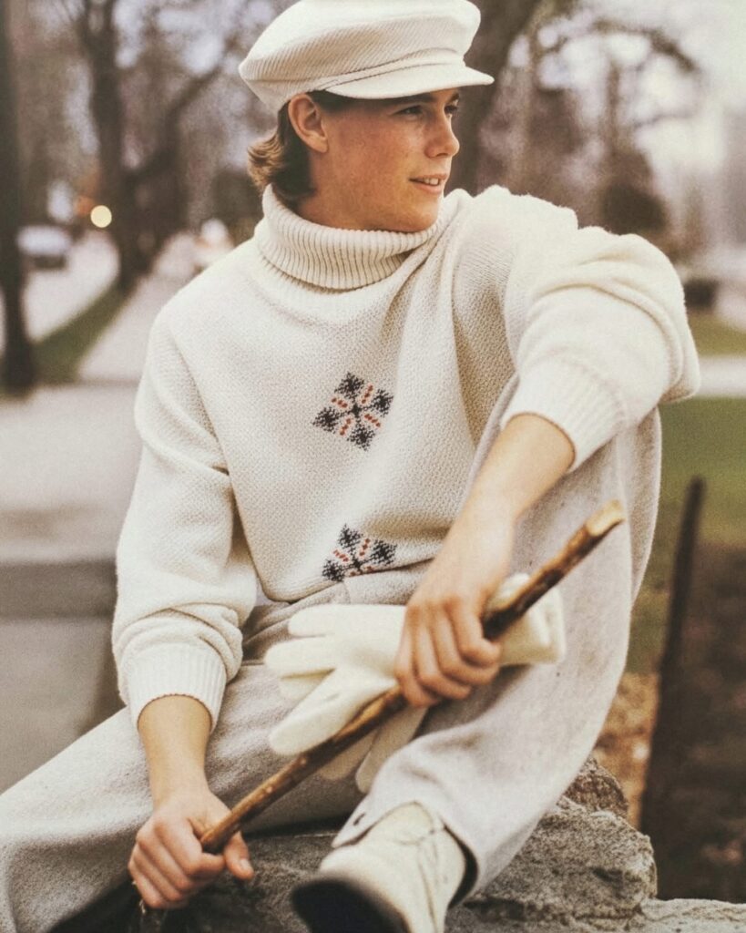 En 1980 Christopher Atkins pose pour le couturier Gianni Versace dans une tenue inspirée par les matières et les motifs des années 1930.