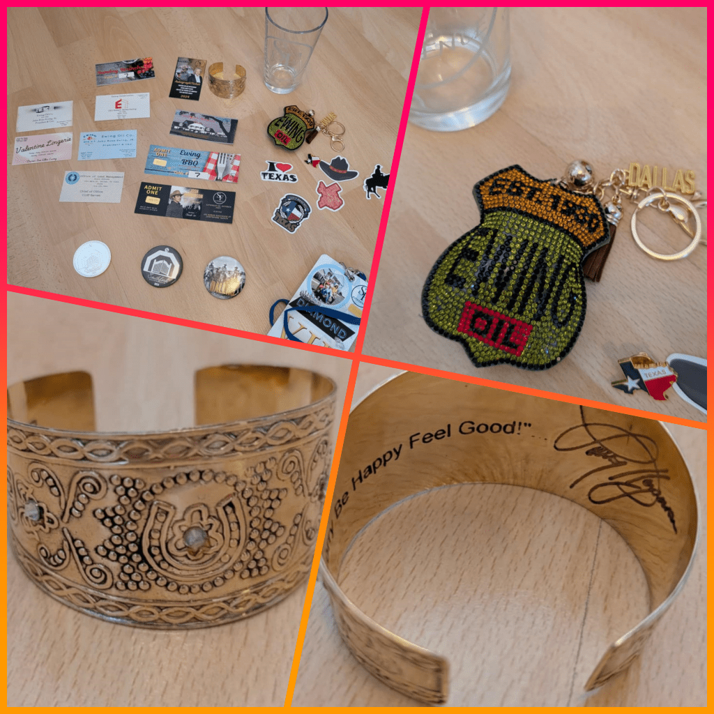 Ci-contre les ‘Goodies’ offert aux porteurs d’un pass VIP lors de l’événement Southfork Expérience. De merveilleux souvenirs en plus des autographes et des discussions avec les acteurs…