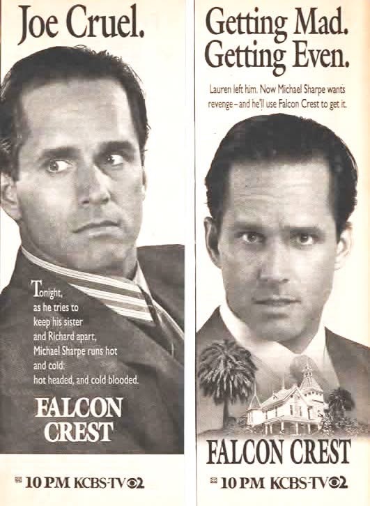 Mais en cachette Angela rencontre Michael Sharpe autour de leur intérêt commun : pour lui empêcher le mariage de Richard et Lauren et pour elle reprendre le contrôle de Falcon Crest.