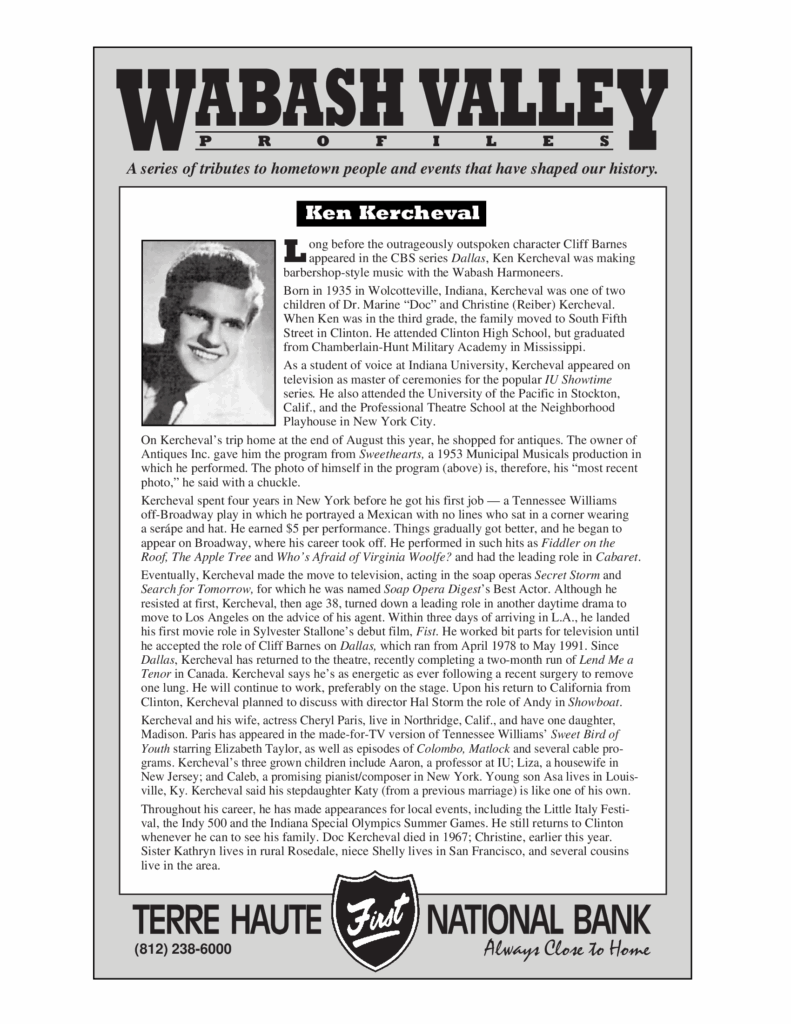 Bien avant que Cliff Barnes, personnage au franc-parler outrageusement prononcé, n’apparaisse dans la série Dallas de CBS, Ken Kercheval composait de la musique de style « barbershop » avec les Wabash Harmoneers.