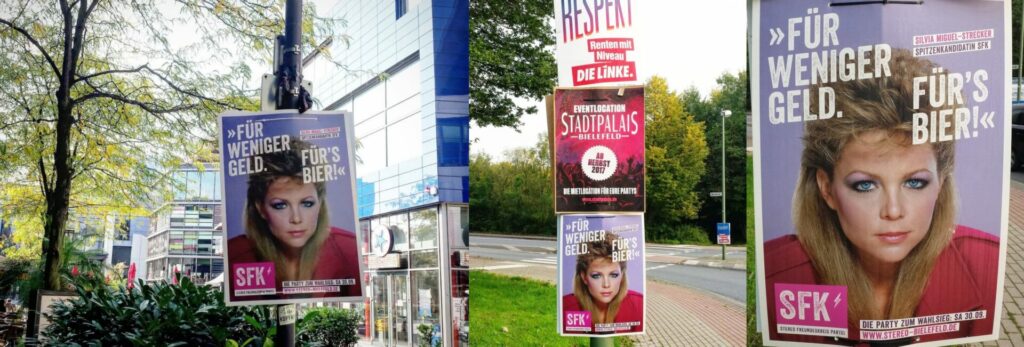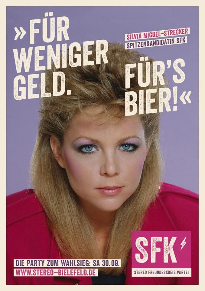 Derrière cette opération se cachait en réalité la discothèque Stereo, un club bien connu de Bielefeld, qui avait décidé de détourner l’ambiance des élections pour une campagne humoristique. Le club inventa une candidate fictive, Silvia Miguel-Strecker, présentée comme la tête de liste du faux parti SFK – Stereo Freundeskreis Partei (« Parti du Cercle d’amis de Stereo »).